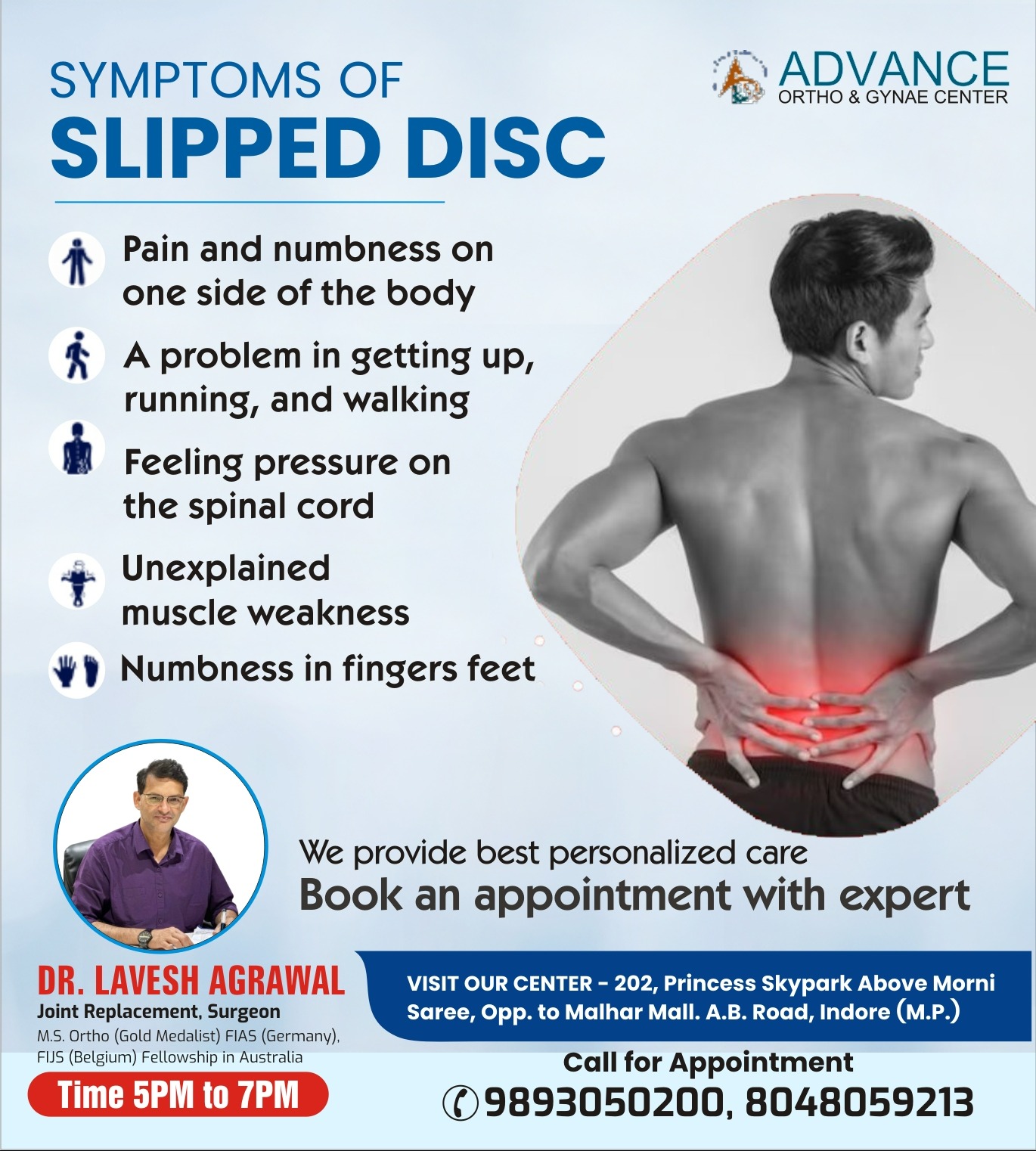 If you are suffering from persistent back pain due to a slipped disc, consult , the best doctor for slipped disc treatment in Indore at Advance Ortho & Gynae Center. Dr. Lavesh Agrawal is a highly experienced orthopedic specialist known for accurate diagnosis and effective management of spine-related conditions.