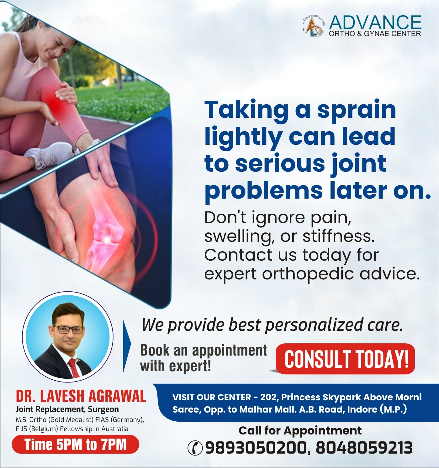 Looking for the best doctor for sprain treatment in Indore? Dr. Lavesh Agrawal at Advance Ortho & Gynae Center is a trusted orthopedic specialist known for accurate diagnosis and effective care for ligament sprains, muscle injuries, and joint pain. Whether caused by sports injuries, falls, or daily strain, sprains require timely treatment to prevent long-term complications. Dr. Lavesh Agrawal best orthopedic doctor in Indore provides comprehensive evaluation using advanced diagnostic methods and offers personalized treatment plans, including medication, bracing, physiotherapy, and rehabilitation guidance. His patient-centered approach focuses on reducing pain, restoring mobility, and ensuring faster recovery. At Advance Ortho & Gynae Center, patients benefit from modern facilities, experienced staff, and compassionate care in a comfortable environment. If you are experiencing swelling, stiffness, or difficulty moving a joint, consult Dr. Lavesh Agrawal for reliable sprain treatment and expert orthopedic care in Indore.