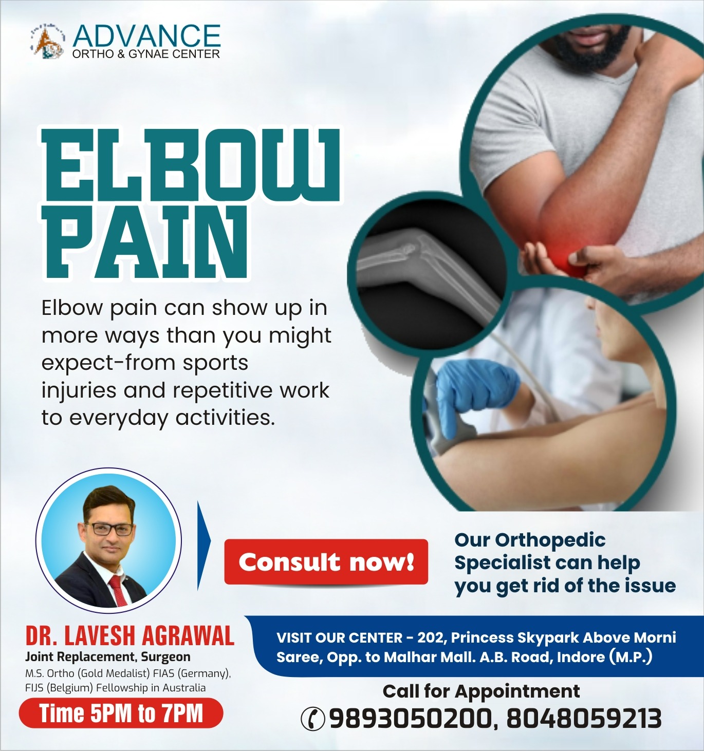If you are looking for the best elbow pain specialist in Indore, Dr. Lavesh Agrawal at Advance Ortho & Gynae Center is a trusted name for advanced orthopedic care. He specializes in diagnosing and treating all types of elbow problems including tennis elbow, golfer’s elbow, ligament injuries, arthritis, stiffness, fractures, and sports injuries. With a patient-focused approach, Dr. Lavesh Agrawal provides accurate diagnosis, non-surgical management, physiotherapy guidance, and advanced surgical treatment whenever required.