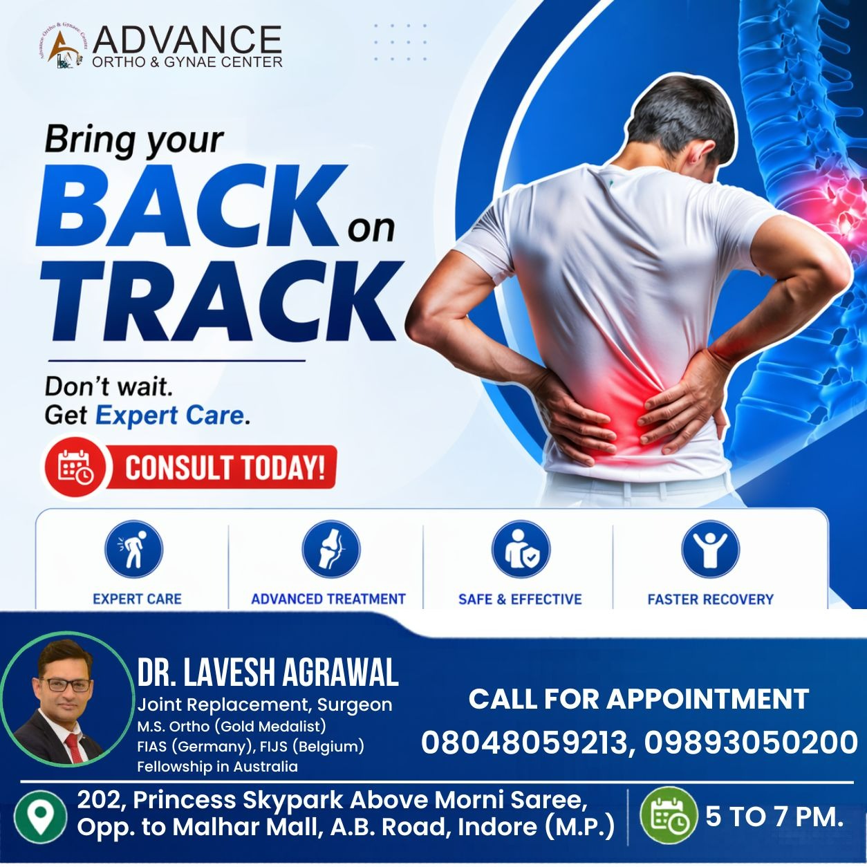 At Advance Ortho & Gynae Center, patients receive compassionate care, advanced treatment options, and guidance for long-term spine health. Don’t let back pain slow you down—consult Dr. Lavesh Agrawal today and take the first step toward lasting relief and improved mobility.