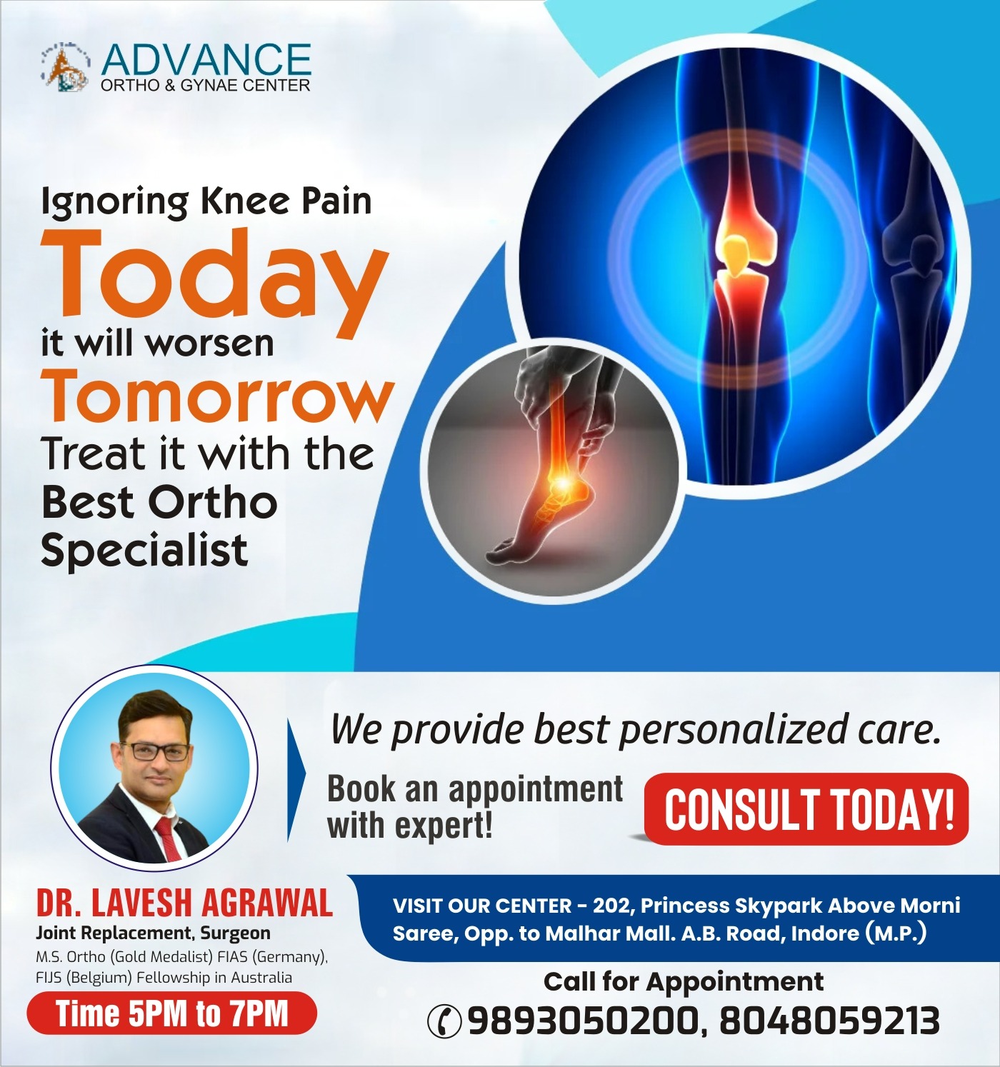Dr. Lavesh Agrawal is a highly trusted knee pain specialist in Indore, providing advanced and result-oriented orthopedic care at Advance Ortho & Gynae Center. He specializes in diagnosing and treating all types of knee problems, including arthritis, ligament injuries, cartilage damage, sports injuries, and age-related joint pain. With a patient-focused approach, Dr. Lavesh Agrawal best orthopedic specialist in Indore offers personalized treatment plans that may include medication, physiotherapy guidance, injections, or advanced surgical solutions when required. Known for his precise diagnosis and compassionate care, he focuses on relieving pain, restoring mobility, and improving overall joint function. At Advance Ortho & Gynae Center, patients benefit from modern facilities, advanced treatment techniques, and comprehensive care under one roof. If you are looking for the best knee pain specialist in Indore, consult Dr. Lavesh Agrawal for trusted expertise, effective treatment, and long-lasting relief to help you return to an active lifestyle.