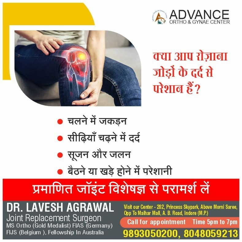 यदि आप लगातार जोड़ों के दर्द से पीड़ित हैं, तो इंदौर के सर्वश्रेष्ठ जोड़ों के दर्द के विशेषज्ञ डॉ. लवेश अग्रवाल से एडवांस ऑर्थो एंड गायनेकोलॉजी सेंटर में परामर्श लें। डॉ. अग्रवाल एक अत्यधिक अनुभवी ऑर्थोपेडिक विशेषज्ञ हैं, जो जोड़ों से संबंधित समस्याओं के सटीक निदान और प्रभावी उपचार के लिए जाने जाते हैं।