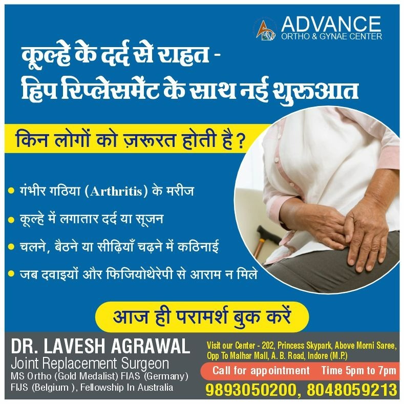 एडवांस ऑर्थो और गायनी सेंटर में डॉ. लवेश अग्रवाल द्वारा की जाने वाली एडवांस्ड हिप रिप्लेसमेंट सर्जरी से दर्द-मुक्त गतिशीलता फिर से पाएं और अपने जीवन की गुणवत्ता में सुधार करें। आधुनिक ऑर्थोपेडिक देखभाल में विशेषज्ञता रखने वाले डॉ. लवेश अग्रवाल, जो इंदौर के सबसे अच्छे ऑर्थोपेडिक डॉक्टर हैं, कूल्हे के गंभीर दर्द, गठिया, फ्रैक्चर या जोड़ों की क्षति से पीड़ित रोगियों के लिए प्रभावी समाधान प्रदान करते हैं।