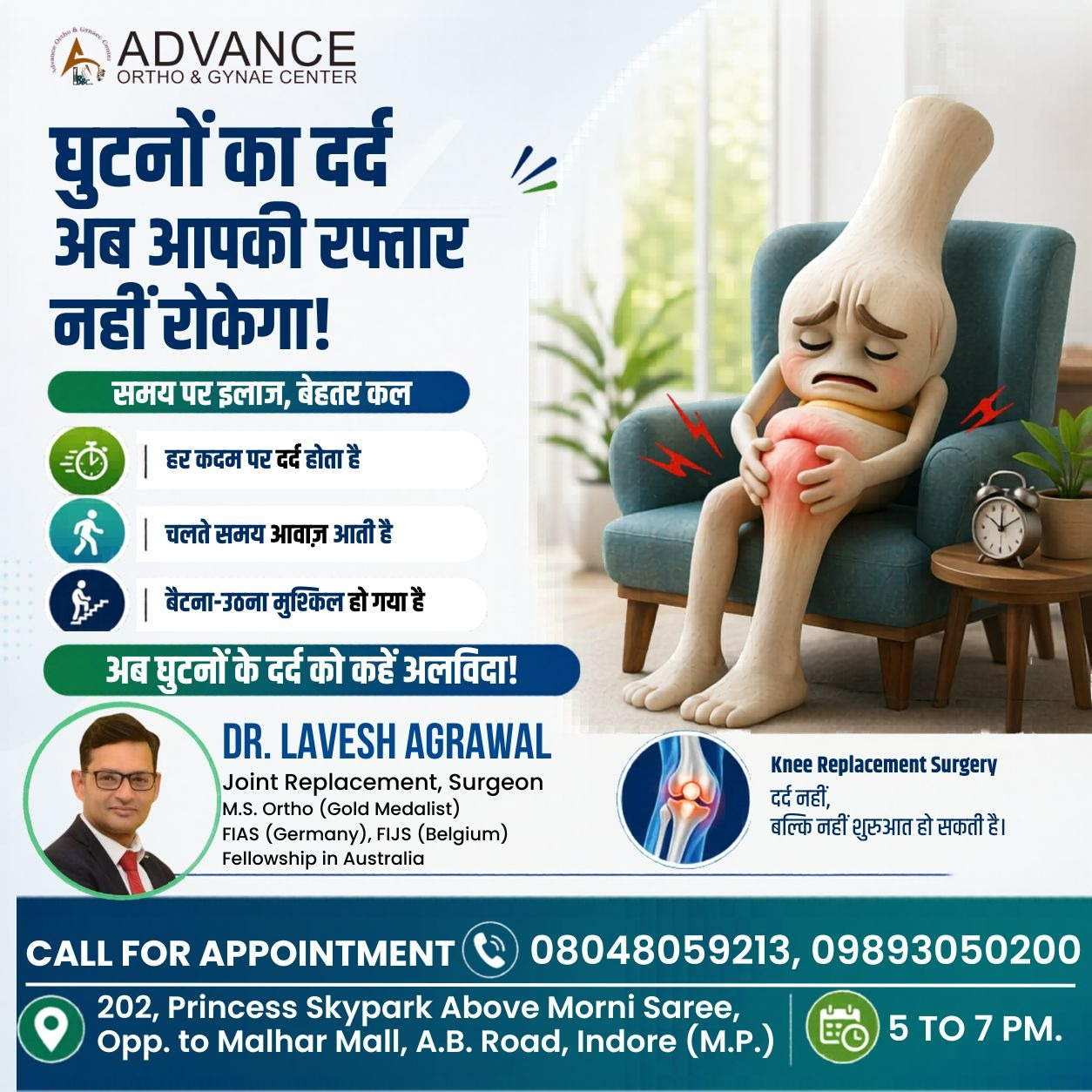 क्या आप इंदौर में सबसे अच्छी घुटने बदलने की सर्जरी की तलाश में हैं? Advance Ortho & Gynae Center में डॉ. लवेश अग्रवाल, एडवांस्ड ऑर्थोपेडिक देखभाल के लिए एक भरोसेमंद नाम हैं। पूरे और आंशिक घुटने बदलने की प्रक्रियाओं में व्यापक अनुभव के साथ, डॉ. लवेश अग्रवाल—जो इंदौर के सबसे अच्छे ऑर्थोपेडिक डॉक्टर हैं—गंभीर घुटने के दर्द, गठिया या जोड़ों की क्षति से पीड़ित रोगियों के लिए सटीक निदान, न्यूनतम चीरा लगाने वाली तकनीकें और तेजी से ठीक होने का आश्वासन देते हैं।