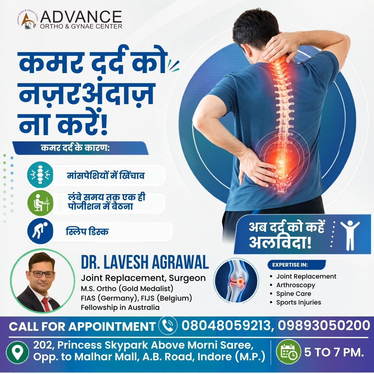 Advance Ortho & Gynae Center में हम कमर दर्द और रीढ़ से जुड़ी सभी समस्याओं का आधुनिक और प्रभावी इलाज प्रदान करते हैं।